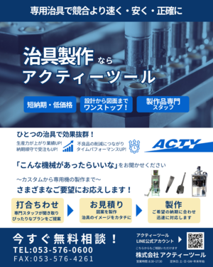 静岡県湖西市の機械工具総合商社の株式会社アクティーツールでは、各種工場の機械工具・切削刃物・工作機械に関する工具・部品調達から、商品開発時や製造現場での生産性向上の為の工具選択の相談やご提案までスピードと熱意を持って営業しています。